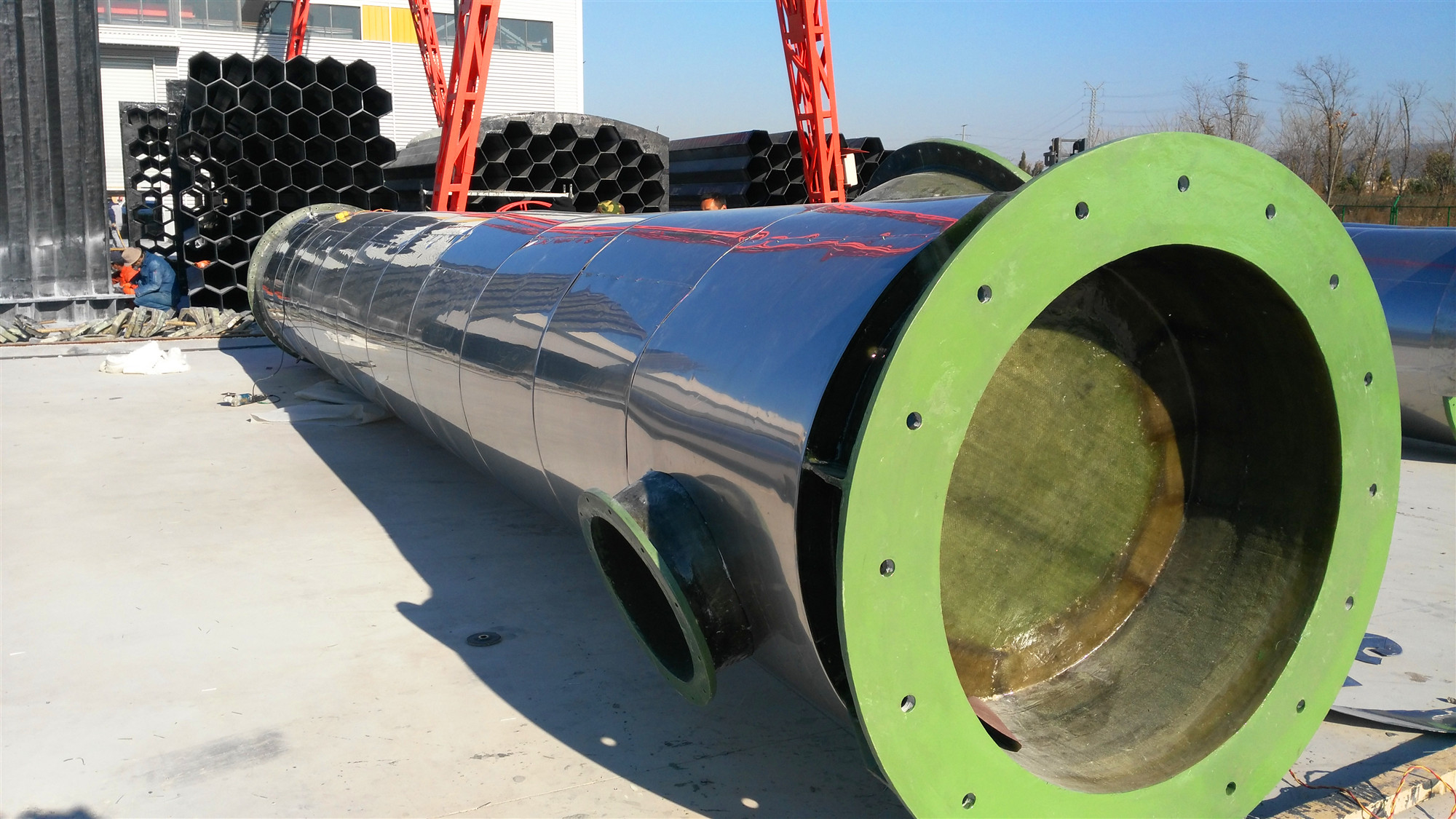 第一步:用平板车把第一段烟囱内筒的管段运送到烟囱底部。